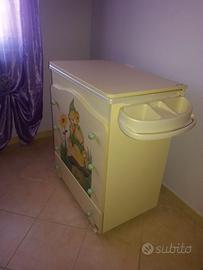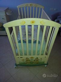 Vendo culletta in vero legno massello con fantasia gnometti completa di settimino e fasciatoio che alzando diventa vasca per bagnetto. In più in regalo paracolpi e piumone abbinato.