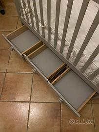 E' dotato di tre cassetti, il piano del lettino ha due altezze: la più alta per quando il neonato è piccolo e non è in grado di alzarsi (quindi non corre il rischio di cadere), la seconda quando è un po' più grande e ha una mobilità maggiore.