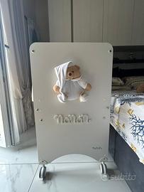 Si può dire che non è stata proprio usata, che e vergine, poiché abbiamo provato giusto un paio di volte ma ormai nostro figlio gia lo avevamo abituato nel letto. 3 livelli di altezza Dimensioni: 94×52×88cm Il delizioso lettino Co-sleeping Tato è un dolce lettino che si può affiancare al letto della mamma. E' fornito di 3 diversi livelli di altezza per il materasso e di 2 differenti livelli di altezza per la spondina laterale, per consentire massimo comfort e sicurezza al bambino. E' impreziosito dal tenerissimo peluche Tato e dalla scritta "Nanàn" applicati. Altezze da terra alle doghe del lettino: 40 cm - 46 cm - 50 cm. II materasso, posizionato sulle doghe, è alto circa 6/7 cm.