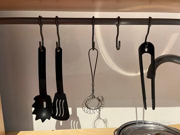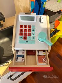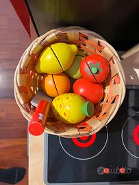Vendo cucina Ikea in ottime condizioni con mestoli (1 mancante come da foto) pentoline, cestino di frutta di legno e velcro con coltello, cassa tipo supermercato.