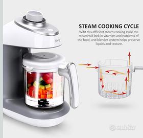 Con il cuocipappa KYG, ottieni un potente dispositivo completo per la preparazione di alimenti per l'infanzia. 5 funzioni per non lasciar nulla a desiderare quando si tratta di preparazione rapida e delicata di alimenti per bambini: cuocere a vapore, miscelare, sterilizzare, riscaldare e scongelare in un unico apparecchio. Oltre ai benefici della cottura a vapore, la preparazione degli alimenti per infanti non è solo più pratica, ma anche più efficiente dal punto di vista energetico, in quanto può facilmente cuocere diversi tipi ingredienti uno sull'altro. Il modello è compatto, quindi può essere riposto più facilmente per risparmiare spazio. La miscelazione e la cottura a vapore possono essere fatte indipendentemente. L'omogeneizzatore KYG BFP-1800MT può anche essere usato per scongelare e riscaldare i cibi già cotti, ma non per cuocere al vapore alimenti surgelati e per cucinare riso e pasta.