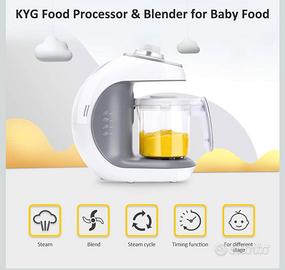 Con il cuocipappa KYG, ottieni un potente dispositivo completo per la preparazione di alimenti per l'infanzia. 5 funzioni per non lasciar nulla a desiderare quando si tratta di preparazione rapida e delicata di alimenti per bambini: cuocere a vapore, miscelare, sterilizzare, riscaldare e scongelare in un unico apparecchio. Oltre ai benefici della cottura a vapore, la preparazione degli alimenti per infanti non è solo più pratica, ma anche più efficiente dal punto di vista energetico, in quanto può facilmente cuocere diversi tipi ingredienti uno sull'altro. Il modello è compatto, quindi può essere riposto più facilmente per risparmiare spazio. La miscelazione e la cottura a vapore possono essere fatte indipendentemente. L'omogeneizzatore KYG BFP-1800MT può anche essere usato per scongelare e riscaldare i cibi già cotti, ma non per cuocere al vapore alimenti surgelati e per cucinare riso e pasta.