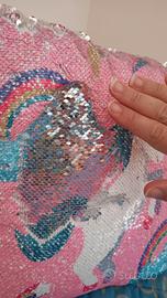 Cuscino con paillettes reversibili argentate e con disegno unicorno, perfetto per arredare la cameretta di una bimba. Si spedisce federa e cuscino interno.