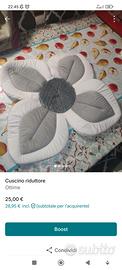 Cuscino morbidissimo da usare come riduttore per lavandino o vaschetta per il bagnetto dei neonati. I bambini sono al sicuro abbracciati dai petali del cuscino, non rischiano di sbattere la testa nel lavandino e non rischiano di scivolare con viso dentro l'acqua perché il cuscino gli fa da sdraietta. Lo si può strizzare dopo l'uso e appenderlo all'aria aperta o lavarlo in lavatrice 30 gradi delicati e asciugatrice programma delicati. Misura 75x75x2 cm di spessore.