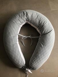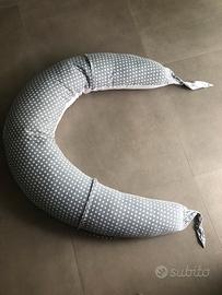Cuscino molto versatile da usare in gravidanza per sostenere la pancia e la schiena durante il sonno; durante l’allattamento permette di assumere una posizione corretta sia per la mamma che per il bambino e se chiuso con gli estremi della fodera diventa una sorta di nido che può essere utilizzato per sostenere il bambino non appena inizia stare seduto da solo.