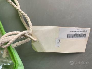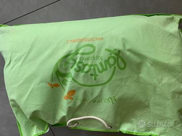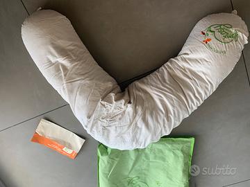 Vendesi cuscino per neonati in fibra completamente naturale, sfoderabile e completamente lavabile in lavatrice. Il cuscino serve per posizionare il neonato per l allattamento o per tenerlo sorretto sino a un anno (quando hanno bisogno di sostegni). Anti acari perche naturale. Completo di sacca per trasportarlo e foglio di istruzione. Pagato 75 euro in negozio specializzato in prodotti bio e sani per bambini. Consiglio di lavare la fodera di cotone esterna prima dell’utilizzo. Pacco medio