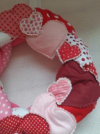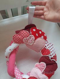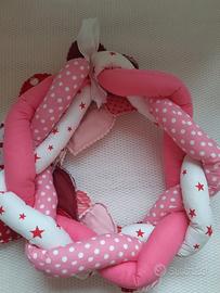 Cuscino tondo e intreciato con cuoricini da appendere sopra il lettino, oppure si puo usare per appoggiare il bambino dentro