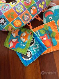 Morbido cuscino per i più piccoli per fare tummy time con 3 giocattoli rimovibili: uno specchietto, un libretto in tessuto e un anello con palline colorate che tintinnano.