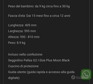 Seggiolino auto pallas g2 Plus moon black acqusitato e mai utilizzato perché mio figlio non ci vuole stare quindi abbiamo adottato un altro metodo, quindi lo vendo davvero nuovissimo con scatola originale manuale e senza nessun segno.