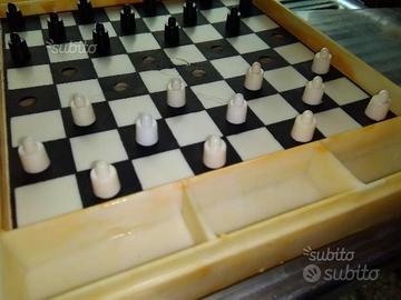 1 gioco per bambini dama e scacchi da viaggio degli anni 60 in buone condizioni , un po i coperchi hanno hanno qualche crepa . misura 19 cm per 15 cm . da una parte gli scacchi e dall'altra la dama . con buchetti per far entrare le pedine . non si rileva la marca . risalenti ai primissimi anni 60 ( 1963 ) .naturalmente nell'immagine se ne vedono 2 di giochi ma l'offerta si riferisce solo ad uno . due immagini per capire come e' costituito il gioco .