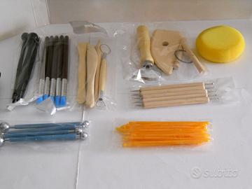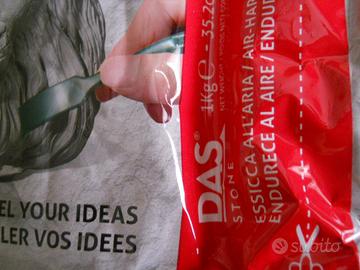 Kit composto da: un panetto DAS da 1 Kg colore pietra + confezione nuova 12 colori tempera marca Primo + 1 boccettina nuova di VerniDas da 33 ml nuova + 1 Set di attrezzi per lavorazione Das, ceramica, terracotta composto da 42 pezzi di cui alcuni usati solo 2 volte, altri ancora sigillati, vedi foto; nell'ulitma é rappresentato lo schema degli attrezzi presenti.