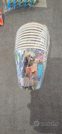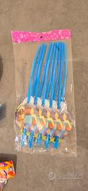 Kit composto da 8 pezzi: 1 tovaglia plastificata, 1 striscione a triangoli, 10 piattini, 10 bicchieri, 10 forchette, 6 trombette, 6 fischietti e 10 cannucce. Nuovo con cartellino.