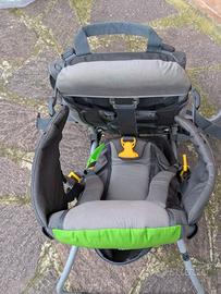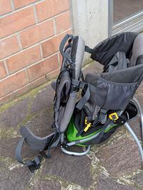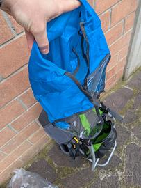 Ottimo stato, dotato di ampio compartimento sul retro (vedi foto), parasole rimuovibile (anche questo con tasca cerniera superiore) e antipioggia (blu nella foto) che copre la parte superiore della testa del bambino. Questo modello non ha ghette.
