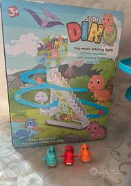 Giochino guardato i primi giorni e poi accantonato,tutto pari al nuovo,solo l’insegna di carta plastificata è leggermente piegata,funziona tutto perfettamente,fornito di 3 dinosauri con 2 rotelle ciascuno