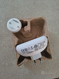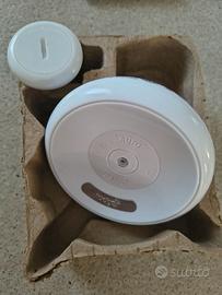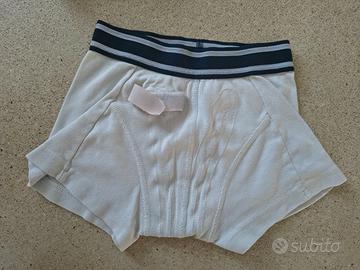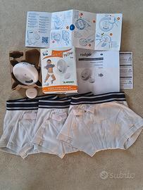 Sistema di allarme pipì a letto senza fili, composto da: -3 paia di mutande -trasmettitore da attaccare agli slip speciali con 2 bottoni a pressione + velcro -ricevitore da alimentare tramite presa da muro attraverso la spina integrata, o in alternativa tramite 2 batterie AA. Impostabile con diversi toni e volumi di allarme. Funzionamento Alle prime gocce di pipì rilevate dal sensore, il ricevitore emette il segnale acustico selezionato, fino a quando non viene premuto il tasto reset, che spegne l’allarme e lo resetta per il prossimo utilizzo. L'allarme sveglia il bambino, addestrandolo a riconoscere il segnale di vescica piena. In questo modo ci si libera del problema di enuresi notturna nel giro di poche settimane. Taglia 128. Vendo perfettamente funzionante. Unico segno di utilizzo: un paio delle 3 mutande ha una piccola parte di elastico un po' sfilacciata.