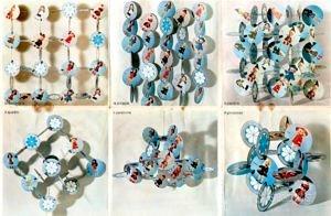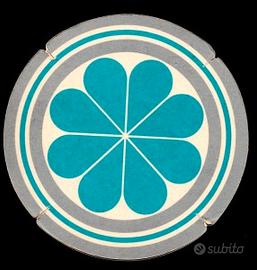 mentre sull'altro è stampato un fiore stilizzato a 8 petali (bianco su azzurro o azzurro su bianco) contornato da cerchi concentrici argento, bianco, azzurro, bianco, argento. Lungo la circonferenza di ciascun disco sono praticati dei piccoli tagli che permettono di incastrare i vari dischi l'uno nell'altro.
