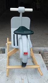 Dondolo in legno adatto a bambini da 1 a 4 anni. Fatto completamente a mano, verniciatura ad acqua. Una etichetta sotto trasparente personalizza con il nome del bambino il regalo.
