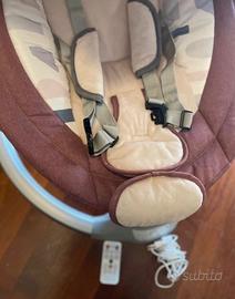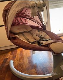 Vendo dondolo elettrico Bebe2luxe, ideale per rilassare e calmare il neonato in totale sicurezza. Dotato di pannello di controllo LED con schermo, 12 melodie integrate e porta USB per ascoltare musica personalizzata. Il dondolio è silenzioso con movimento laterale naturale, regolabile su 5 livelli di oscillazione e con timer programmabile (8/15/30 minuti). Completo di imbracatura di sicurezza a 5 punti e cuscino poggiatesta imbottito per garantire comfort e stabilità al bambino.