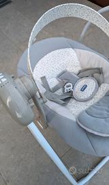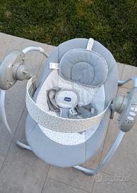 Sdraietta / altalena per bebè. Adatto fin dalla nascita grazie al morbido riduttore. Utilizzo consigliato: 0–6 mesi (fino a 9 kg). Schienale reclinabile in 2 posizioni. Dotata di 5 velocità di oscillazione, con diverse melodie e suoni della natura per tranquillizzare e intrattenere il bambino. Si chiude in modo compatto per riporlo facilmente. Perfettamente funzionante e in ottime condizioni. Segnalo solo la mancanza dei due pendenti in stoffa dalla barra dei giochi, facilmente sostituibili con altri pendagli o giochini.
