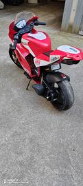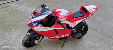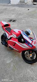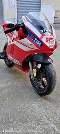 Vendo Ducati GP desmosedici funzionante può raggiungere due velocità. Le manopole sono rivestite in gomma antiscivolo, la manopola destra serve anche da acceleratore e può far raggiungere i 3,8 Km/h impostata sulla prima velocità e i 7,6 Km/h sulla seconda. La velocità più alta può essere impostata da un adulto tramite un pulsante posto sotto il tappo serbatoio. Ducati GP è dotata di ruote stabilizzatrici (rimovibili) per i piccoli guidatori ancora inesperti. Il freno è meccanico, proprio come nelle moto vere e si aziona premendolo con il piede. ETA': 3-8 anni (max portata 30 Kg.) POSTI: 1 MASSIMA PENDENZA: 10% RUOTE MOTRICI: 1 BATTERIE: 12 Volt DURATA BATTERIE: 50 minuti VELOCITA' MASSIMA: 4,3 Km/h prima marcia, 8,3 Km/h seconda marcia. Rombo motore, clacson (2 Pile AA da 1,5 Volt per i suoni ) Acceleratore a manopola 2 marce avanti Sospensioni anteriori Ruote con battistrada in gomma Ruote stabilizzatrici Freno a pedale Cavalletto.