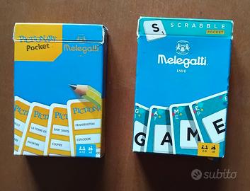 Due giochi per bambini – Melegatti - Livello di età 8+ - Paese di origine Italia – Materiale Carta, Cartone – Marca Mattel - Numero di giocatori minimo 2 giocatori N° 1 - Scrabble Pocket - Gioco di Carte Melegatti - Un gioco di carte in buone condizioni. Perfetto per giocare ovunque - Include carte da gioco e scatola originale marca Melegatti - Ideale per viaggi e momenti di svago - Da collezione o semplicemente da giocarci. N° 1 – Pictionary Pochet - Melegatti/Mattel Edizione 2020 – Colore Blu – Tema Parole - l'iconico gioco da tavolo per tutta la famiglia, 2 squadre con indizi in italiano, Oggetti che sono stati usati poco.