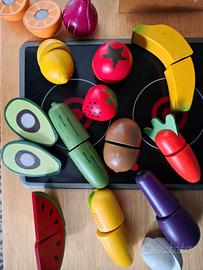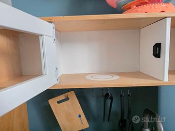 Duktig, cucina gioco Ikea in betulla (72×40×109 cm). Vendo completa di giochi: frutta e verdura in legno, con taglieri e coltelli, pentole e set Disney. Tutto in ottimo stato.