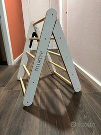 Triangolo da arrampicata di ispirazione Pikler richiudibile con sistema di blocco apertura di sicurezza. Pali in legno massello e doppie cerniere industriali in acciaio indeformabile completano il prodotto che si presenta solido e affidabile.