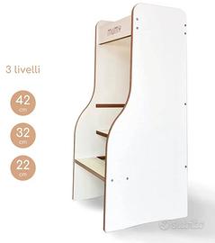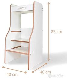 Vendo torre Montessori marca MUMY, in ottime condizioni. Struttura solida in legno multistrato con finitura bianca e bordi in legno naturale. Perfetta per permettere ai bambini di partecipare in sicurezza alle attività quotidiane in cucina o in bagno, stimolando la loro autonomia.