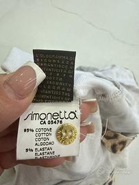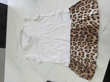 Splendido abitino firmato Roberto Cavalli Junior, perfetto per una piccola fashionista. Il capo unisce l'iconico stile del brand con la comodità necessaria per una neonata. Bianco latte con gonna a contrasto in stampa animalier ( Parte superiore stile polo con colletto classico. Prezioso monogramma RC ricamato sul petto in color oro. Chiusura pratica con bottoncini