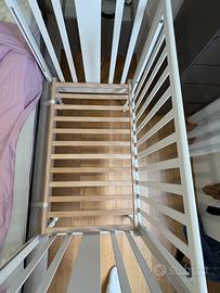 Vendo lettino Erbesi mini molly in legno laccato bianco e orsetti beige. Dimensioni L. 65,5 x P. 110 x H. 98 cm ( dalla nascita fino a circa 2 anni di età). Il lettino permette di togliere una sponda e collegarlo al letto con delle fasce. In perfette condizioni, ha solo una lieve screpolatura di circa mezzo cm in un punto dovuta ad un carillon. Il lettino è completo di kit tessile (copertina, lenzuola a tema, paracolpi, riduttore, cuscino) e di materasso a misura comprati a parte. Vendo prezzo simbolico (spesa totale circa 450€).