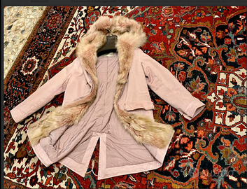 SUPERGLAM parka di colore rosa cipria con inserti in vera pelliccia di VOLPE. Chiusura tramite bottoni automatici e cerniera doppio cursore, stringhini/coulisse di regolazione. Particolarissimo cappuccio trasformabile con apertura a zip, studiato per dispiegarsi e ricadere sulle spalle come un manto avvolgente. Articolo originale collezione A/I ERMANNO SCERVINO. CONDIZIONI: buono stato conservativo usato raramente (necessita di un passaggio in lavasecco presenta delle invisibili macchioline, vedi ultima foto). E' stata recisa l'etichetta della composizione/taglia: queste sono le misure