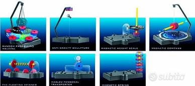 .Far galleggiare una matita a mezz'aria, progettare un trasportatore personale utilizzando il principio del treno maglev levitante, costruire una scultura in metallo che sfida la gravità, una macchina a moto casuale che oscilla in maniera imprevedibile, e altro ancora. Sette progetti in una confezione, tutti strabilianti, quasi magici, pur essendo basati su principi scientifici. La confezione contiene: 1 barra sottile con anello, 1 barra esagonale, 1 barra tonda, 1 adesivo, 1 forma di UFO, 1 corda, 1 rondella, 1 modello grafico (1 per compasso, 1 per la Terra ed 1 per un astronauta), 10 dadi, 7 magneti a forma di anello, 1 chiusura trasparente, 1 divisore, 1 recipiente per pesare, 1 tondino per la corda, 1 puntatore, 1 asse, 1 braccio di supporto, 1 base.