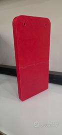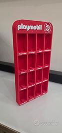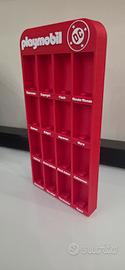 espositore playmobil kinder rosso con nomi e logo in bianco