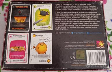 Edizione originale. In italiano. Da 2 a 5 giocatori. Exploding Kittens è un gioco di carte un cui deve mmaginare di essere immerso in un mondo dove la tensione della roulette russa incontra l'irriverenza felina. In questo gioco, il tuo obiettivo è semplice: essere l'ultimo giocatore rimasto in gioco, eliminando gli avversari con l'aiuto di gattini esplosivi. Con un mix di fortuna e strategia, ogni partita è un'esperienza unica e imprevedibile. Ed. Asmodee Italia
