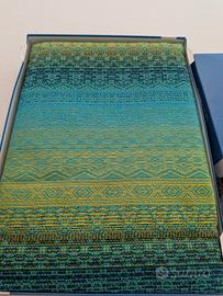 L’ordito in cotone color smeraldo si intreccia armoniosamente con i fili di trama alternati dal blu scuro al turchese, al verde chiaro e al giallo acceso, una sfumatura che fa risplendere il disegno in fresche sfumature di blu, verde e giallo.