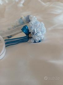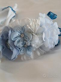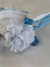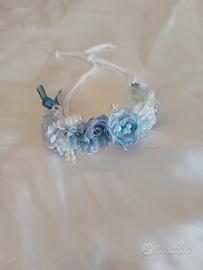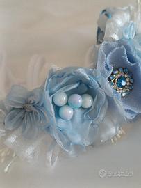 Fascia per capelli new born, composta da fiori di stoffa nei toni del celeste, azzurro e bianco. La fascia è impreziosita da strass, perline e nastrini che la rendono luminosa ed elegante Ideale per cerimonie - È dotata di un nastro bianco che permette di regolare la misura e fissarla alla testa #fascianeonata #fasciacapellineonata #fascianewborn #fasciacapelliconfiori