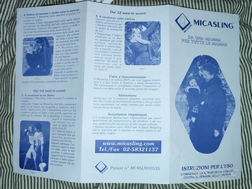 Fascia ad anelli, Micasling originale, si usa dalla nascita fino a 15kg (3 anni circa). In tessuto di cotone pesante e anelli. Su internet si trovano vari videos spiegando come usarla. Si usa a tracolla, su una spalla o l'altra a seconda delle preferenze. Il bambino va posizionato sdraiato se piccolo, seduto se più grande. Ottimo anche per allattare in riservatezza.