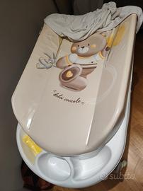 Vaschetta baby bagno con 2 sedute anatomiche antiscivolo (una inclinata per bimbi 0-6 mesi, seduta con braccioli per bimbi da 6 a 12 mesi).
