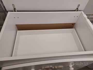 Fasciatoio- bagnetto con 4 cassetti. Il primo più grande perché potrebbe contenere la vaschetta per il bagnetto,gli altri poco più piccoli però molto spaziosi. Ha le rotelle quindi facile da spostare. A disposizione anche il porta sapone e spugnette removibile.