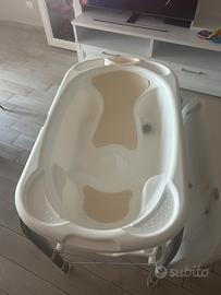 Bagno ideale per il bagnetto dei più piccoli Con 2 sedute anatomiche e antiscivolo una inclinata per bimbi da 0 a 6 mesi e una seduta con braccioli per bimbi da 6 a 12 mesi vani portasapone e porta spugnetta doccino tappo e tubo per scarico dellacqua cassetto