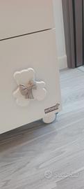 Fasciatoio bagnetto bianco opaco con pomelli a forma di orsetti abbelliti da teneri fiocchi comprati a parte color tortora. Quando il bambino sarà più grande, togliendo la vaschetta e sfilando il piano fasciatoio in pvc, diventerà una pratica cassettiera dove riporre gli indumenti.