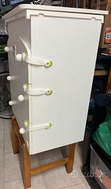 Fasciatoio Bagnetto Foppapedretti "Birbante". Dotato di vaschetta per il bagnetto estraibile, tre ampi cassetti, piano ribaltabile e ruote gommate con sistema frenante.