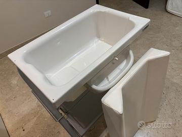 Vendo fasciatoio BREVI composto da struttura metallica richiudivile, base inferiore e contenitore laterale portaoggetti, vasca per bagnetto con tubo per lo svuotamento dell’acqua, fasciatoio superiore rivestito in pelle. Prezzo trattabile se disponibili al ritiro.