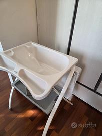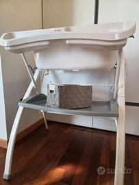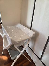 Fasciatoio / Bagnetto marchio Brevi Dotato di doppio vano portaoggetti integrato, materassino fasciatoio con protezioni laterali, vaschetta da bagno e pratico contenitore portaoggetti inferiore. Usato, con qualche difetto (vedi foto), da qui il prezzo "simbolico". Prezzo al nuovo 100 euro.