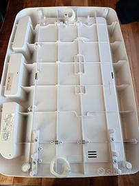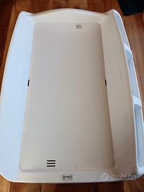 È regolabile per poterlo comodamente agganciare sopra al lettino, oppure semplicemente poggiare su una superficie come un normale fasciatoio.