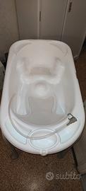 Come nuovo. Fasciatoio mai usato. Vaschetta usata poche volte. Nessun segno di usura. Carrello pieghevole in robusto alluminio con ruote. Ripiano portaoggetti. Incluso il secchiello per la doccia.