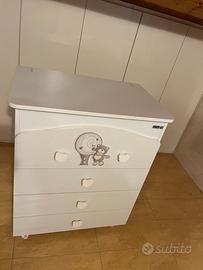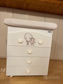 Faaciatoio cam bianco, 4 cassetti, ruote con blocchi, 2 cover di spugna inclusi: uno bianco ed uno azzurro.