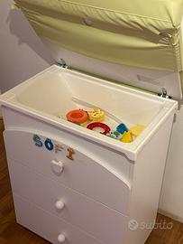 Vendo fasciatoio con struttura come nuova, parte morbida verde da sostituire se si vuole (leggermente aperta nel lato frontale sx). Il fasciatoio con cassettiera ha una vaschetta di plastica al suo interno dove poter fare il bagnetto