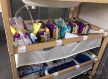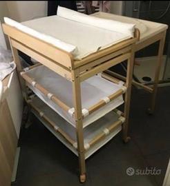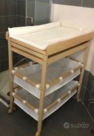Praticissimo fasciatoio munito di materassino con vano vaschetta estraibile per il bagnetto del bambino e due ripiani contenitore in tessuto per riporre tutto il necessario per il cambio e il bagnetto. Questa opzione con il vano vaschetta estraibile consente di far passare comodamente il bambino dal fasciatoio alla vaschetta e dalla vaschetta al fasciatoio dopo aver fatto il bagnetto. No spedizione, solo ritiro.