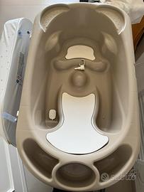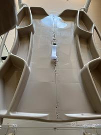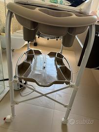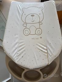 Morbido fasciatoio con sistema anti-ribaltamento, include vaschetta dotata di portasapone e porta spugnetta, con 2 sedute anatomiche e antiscivolo (una inclinata per bimbi da 0 a 6 mesi e una seduta con braccioli per bimbi da 6 a 12 mesi) adatto fino a 11 kg.